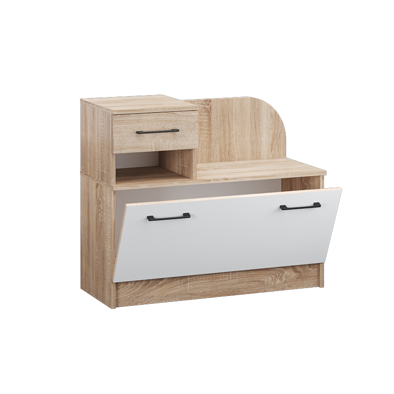 Тумба под обувь с местом для хранения обуви, ящиком, открытой нишей и сиденьем. Характеристики: Размер, мм: 900х750х380 Цвет: Дуб сонома/Белый с тиснением древесные опоры Материал: ЛДСП Особенности: современный стиль хорошая вместимость черные металлические ручки разноплановое наполнение