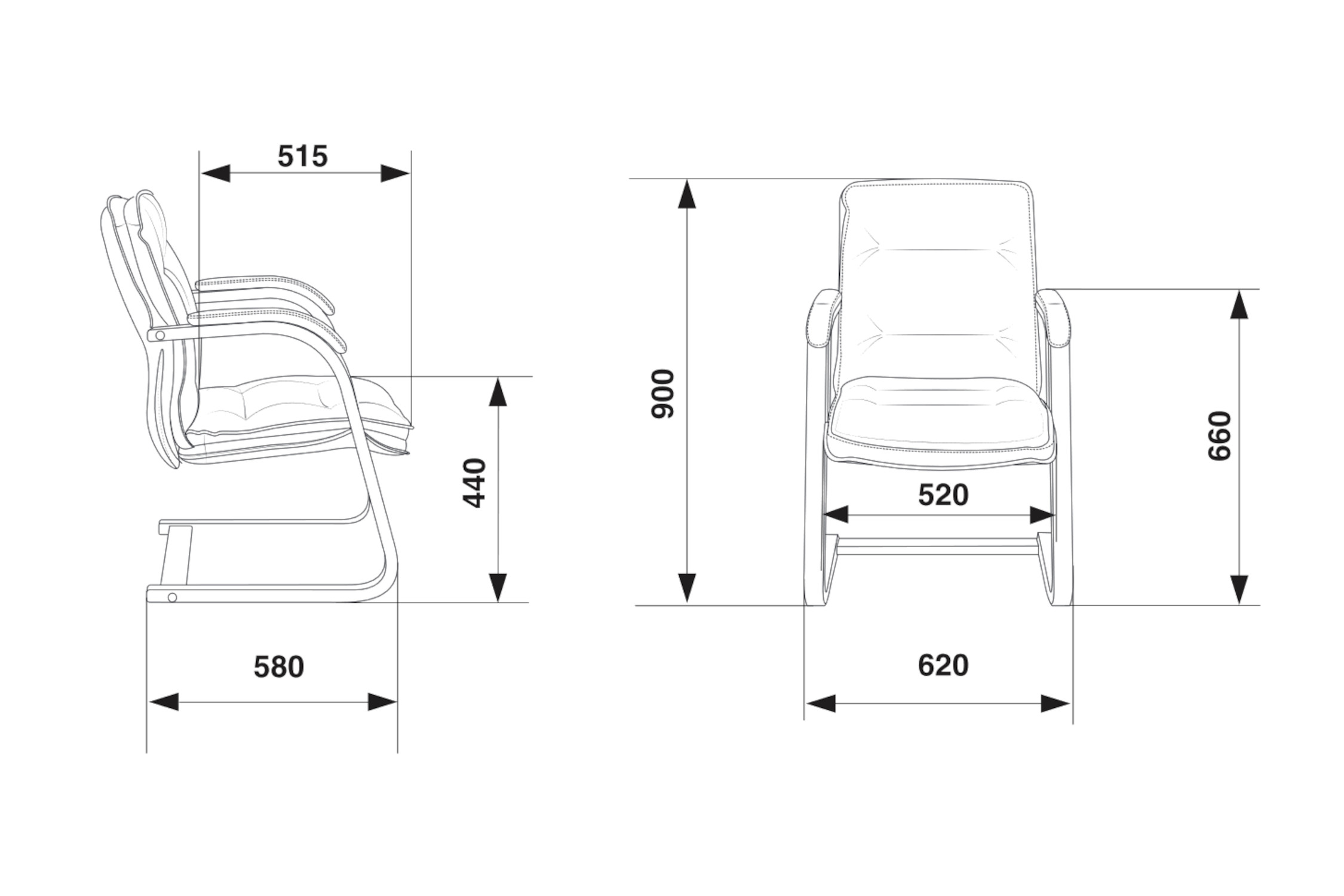 Высота сиденья - 44 см. Высота с подлокотниками - 66 см. Ширина сиденья - 52 см. Глубина сиденья - 51.5 см. Ширина полозьев - 62 см. Подлокотники деревянные цвета «темный орех» с мягкими накладками из натуральной кожи (лицевые части). Полозья - деревянные.
